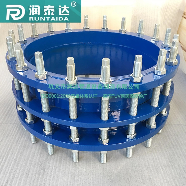 雙法蘭傳力接頭是由兩片法蘭、壓蓋、套筒等組合而成的,與管道連接采用雙法蘭的連接方式,因此管道配對(duì)法蘭的選取尤為重要,傳力接頭出廠一般噴涂孔雀藍(lán)色聚酯防腐漆起到防腐防氧化作用,因此其兩片法蘭上也噴涂有防腐漆,這個(gè)漆的噴涂要均勻,水線(xiàn)臺(tái)不可有斷縫,同時(shí)法蘭的相關(guān)數(shù)據(jù)要和配對(duì)法蘭一致,例如:法蘭中心距、法蘭外徑、法蘭孔數(shù)以及法蘭孔徑等要一致。這樣才能保證產(chǎn)品與管道配對(duì)法蘭連接時(shí)能夠完好的連接,同時(shí)如果有需要可以在產(chǎn)品與配對(duì)法蘭連接時(shí)安裝橡膠密封墊起到更加緊密的作用,如果不安裝密封圈,要保證兩片法蘭的連接螺栓受力均勻,不可壓偏。